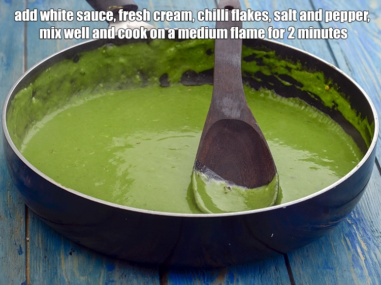 - Add the white sauce, fresh cream, chilli flakes, salt and pepper, mix well and cook on a medium flame for 2 minutes, while stirring occasionally.