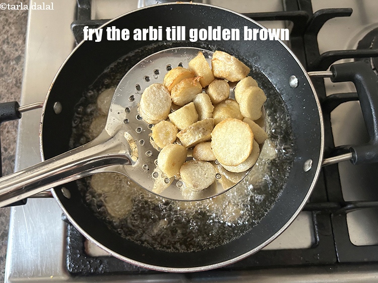- To make fried arbi, heat the oil for deep-frying in a deep non-stick kadhai and deep-fry the arbi slices, a few at a time on a medium flame, till they turn golden brown in colour from all the sides.