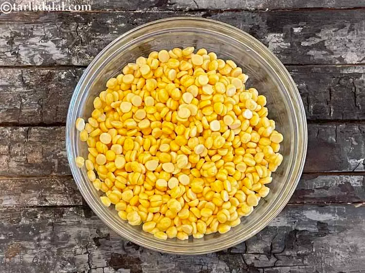 - Soak the chana dal in enough hot water in a deep bowl for 3 hours.