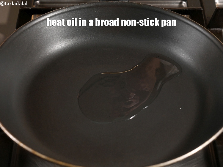 To make veg steamed wontons recipe | Indian style chilli oil wonton recipe | chilli garlic wontons | steamed vegetable wontons | heat 1 tsp oil in a broad non-stick pan.