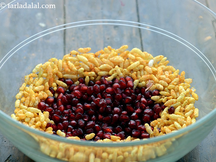 Once the masala puffed rice has come down to room temperature, in the same bowl add fresh pomegranate.