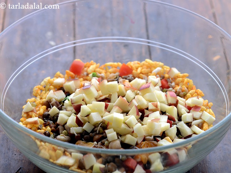 Puffed rice is mixed with fibre-rich sprouts and fruits to satisfy for your craving for chaat recipes. I ve added mixed sprouts in this fruit and vegetable chaat as they are easier to digest and also abound in nutrients like protein, calcium, iron and Vitamin C . Mixed with fruits like apple, orange and pomegranate and flavoured with lemon juice it makes a tantalizingly chatpata snack that’s sure to lift your spirits.