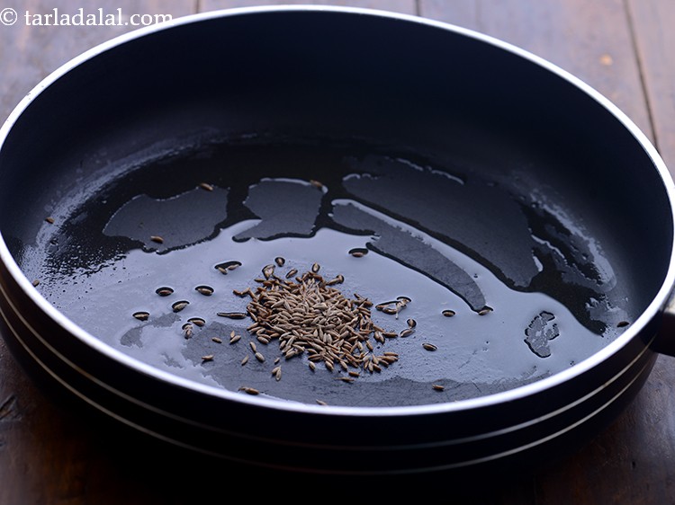 - Heat the oil in a broad non-stick pan and add the cumin seeds.