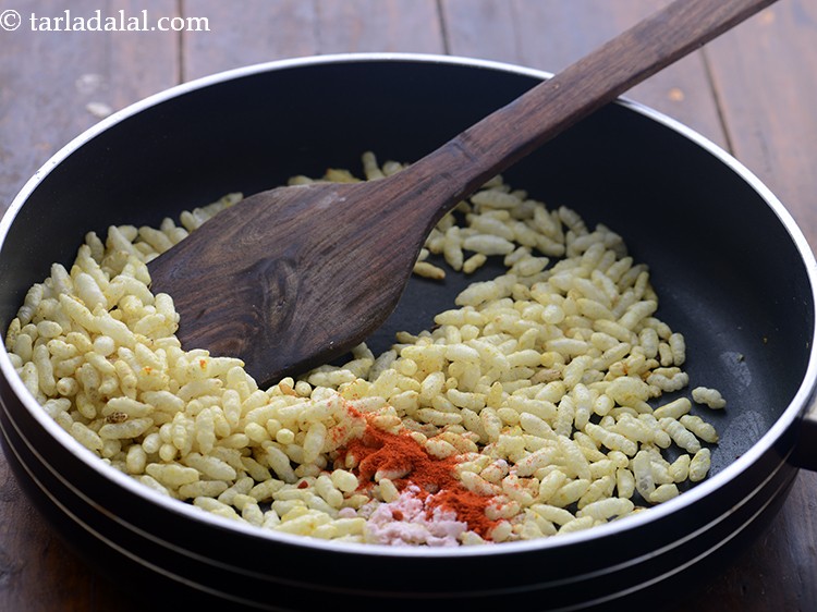 - When the seeds crackle, add the asafoetida, turmeric powder and puffed rice, mix well and cook on a medium flame for 1 minute.