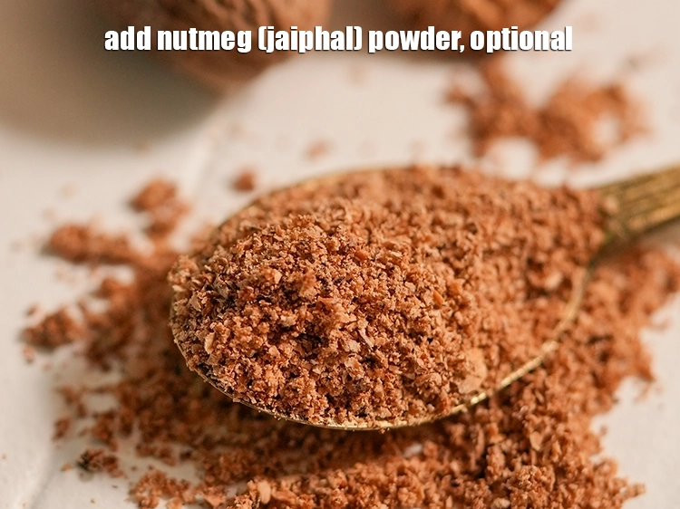 જાયફળ પાવડર ઉમેરો. તાજી છીણેલી જાયફળ પણ ગરમ મસાલા રેસીપી માટે સારી રીતે કામ કરે છે. Add the 1 tbsp nutmeg (jaiphal) powder , optional. Freshly grated nutmeg also works well for the garam masala recipe.