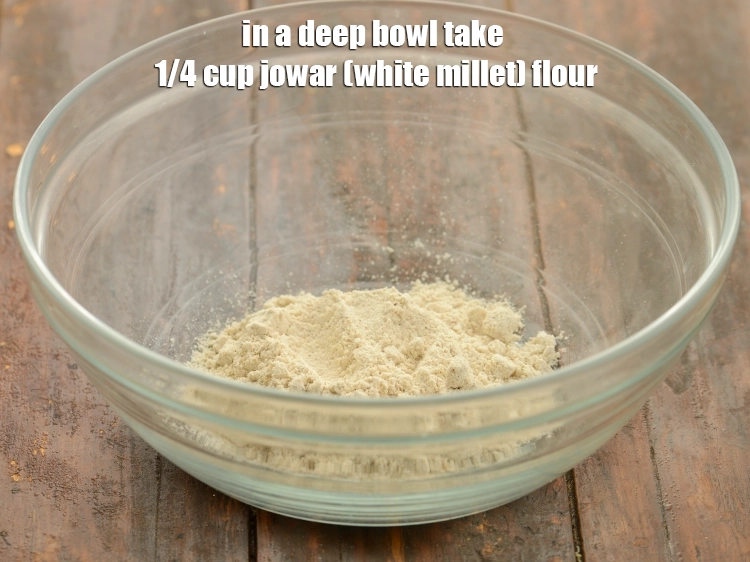 To make dough for green garlic roti recipe | green garlic multigrain roti | healthy green garlic roti | in a deep bowl take 1/4 cup jowar (white millet) flour. Jowar is a gluten-free flour and has many nutritious benefits. Read about 17 Amazing Health Benefits of Jowar Flour.
