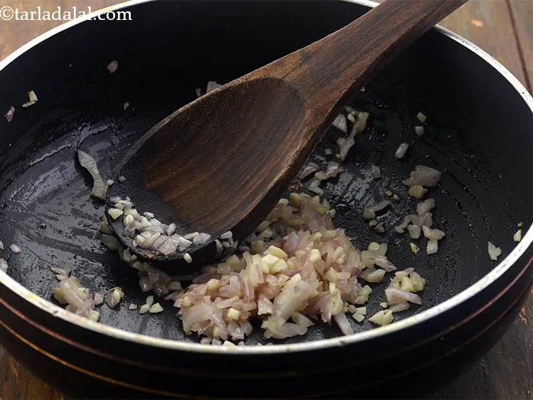 - एक गहरे नॉन-स्टिक पैन में तेल (oil) गरम करें। उसमें लहसुन (garlic) और प्याज (onions) डालें और मध्यम आंच पर 1 से 2 मिनट के लिए भूनें (sauté)।