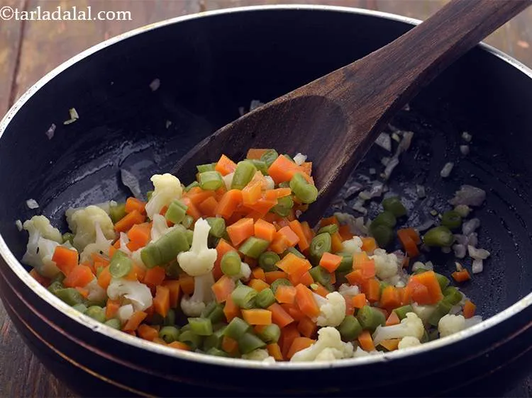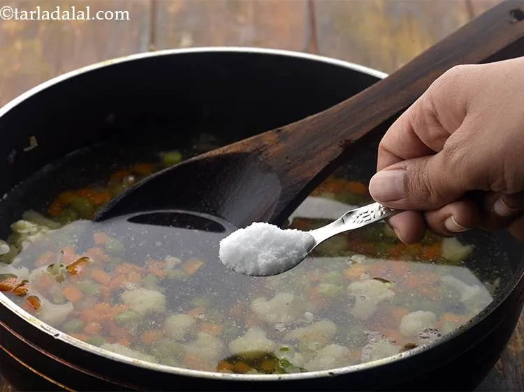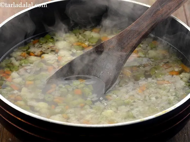 - मिश्रित सब्ज़ियाँ (mixed vegetables), 3 कप पानी (3 cups of water), नमक (salt) और काली मिर्च (pepper) डालें, अच्छी तरह मिलाएं और कभी-कभी चलाते हुए मध्यम आंच पर 2 मिनट तक पकाएं।