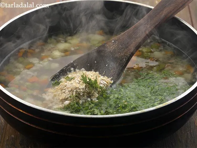 अब, 2 टेबल-स्पून क्विक कुकिंग रोल्ड ओटस् (quick cooking rolled oats) को सूप में जोड़ने का समय आ गया है। यह सूप को मलाईदार बनाता है और हेल्दी वेजिटेबल सूप में फाइबर को भी जोड़ता है।