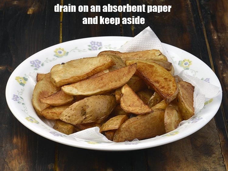 Add the potato wedges (unpeeled) and deep-fry a few at a time till they turn golden brown in colour from both all the sides.