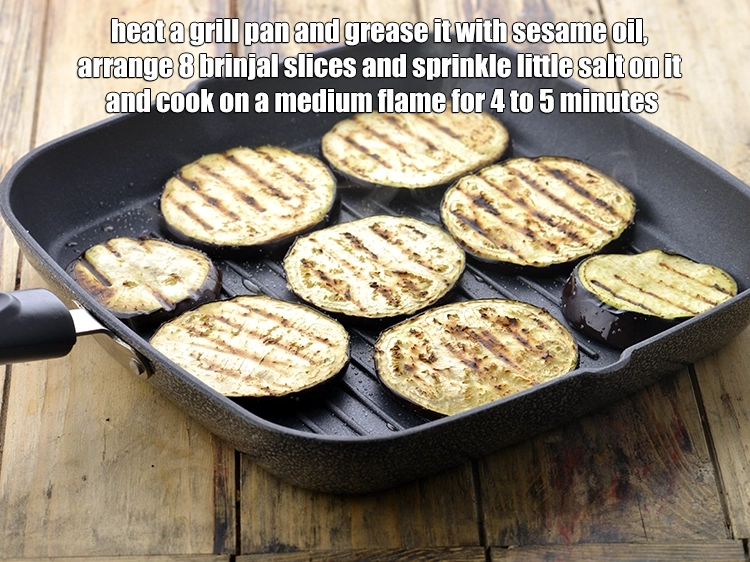 - Heat a grill pan and grease it with sesame oil, arrange 8 brinjal slices and sprinkle little salt on it and cook on a medium flame for 4 to 5 minutes or till they become light brown in colour from both the sides.