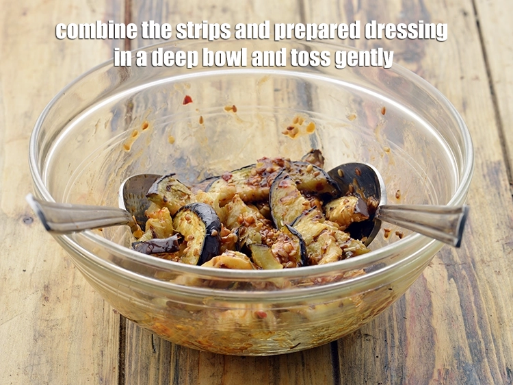 - Combine the strips and prepared dressing in a deep bowl and toss gently.