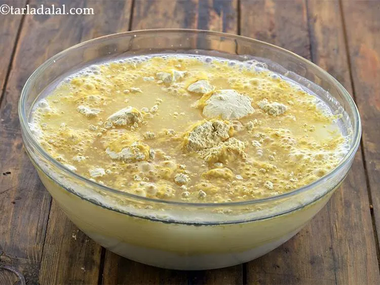 - To make gujarati kadhi, combine the curds and besan in a deep bowl and whisk well till no lumps remain.