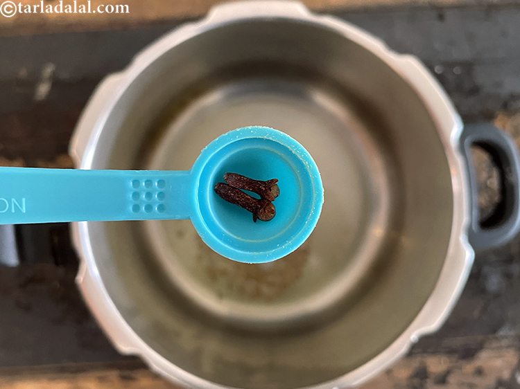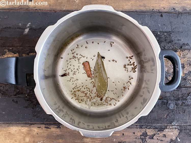 - Heat the ghee in a pressure cooker and add the cumin seeds, cloves, cinnamon and bayleaf.