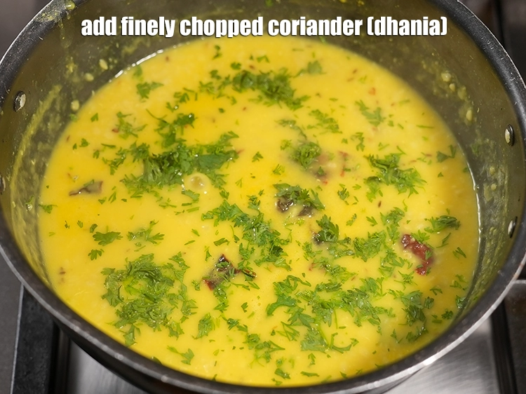 Switch off the flame, add the 2 tbsp finely chopped coriander (dhania).