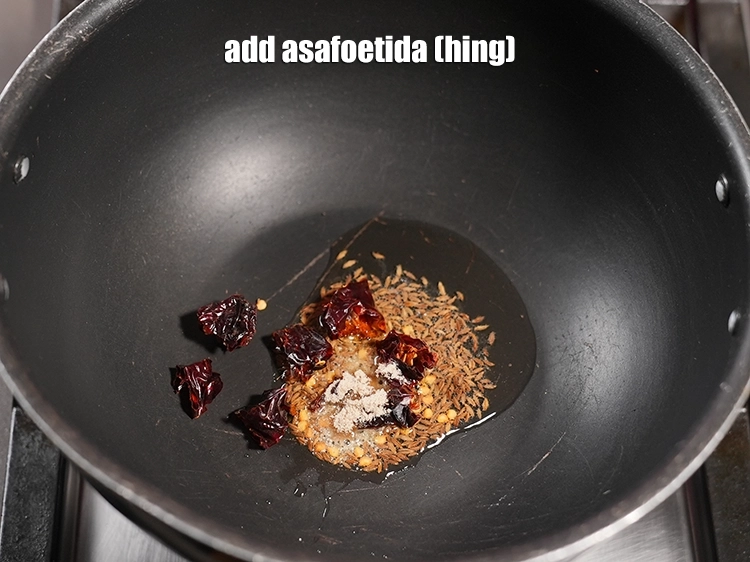- एक गहरे नॉन-स्टिक पैन में तेल गरम करें, उसमें जीरा, हींग और करी पत्ता डालें और मध्यम आँच पर 30 सेकंड तक भूनें।