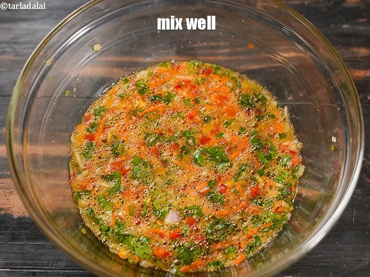 In another bowl, combine the egg whites, onion, tomato, capsicum, carrot, green chillies, salt, pepper, spring onion greens and coriander.