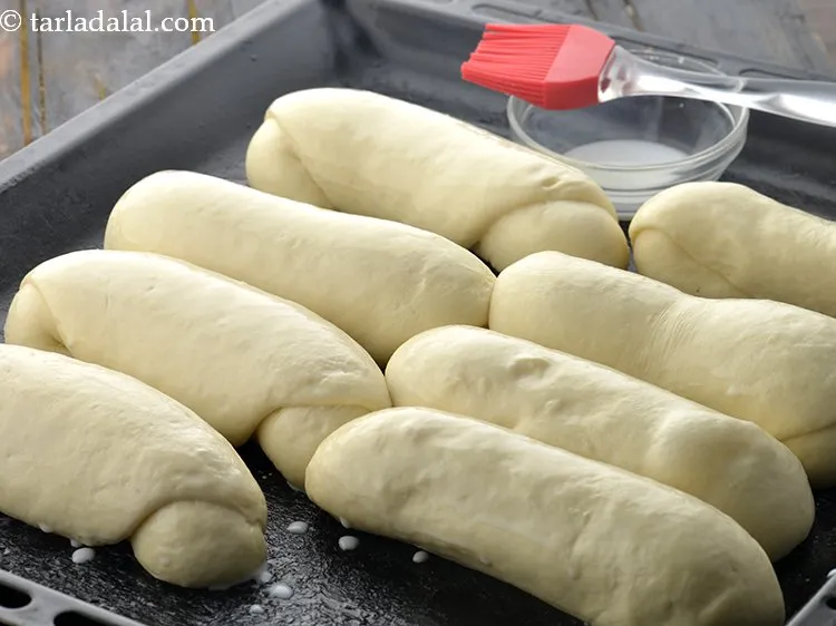 हॉट डॉग रोल बनाने के लिए, एक गहरे कटोरे में गुनगुना गर्म दूध, २ टेबल-स्पून गर्म पानी, चीनी और इंस्टेंट ड्राई यीस्ट डालें, अच्छी तरह मिलाएं और १० मिनट के लिए अलग रख दें। एक कटोरे में तेल और मक्खन अच्छी तरह मिलाएं और एक तरफ रख दें। मैदा, बेकिंग पाउडर, यीस्ट-दूध का मिश्रण और नमक अच्छी तरह से मिलाएं और लगभग १ कप गर्म पानी का उपयोग करके नरम आटा गूंध लें। तेल-मक्खन का मिश्रण डालें और आटा चिकना और लोचदार होने तक फिर से ५ से ८ मिनट के लिए खींचकर गूंधते रहें और मोड़ते रहें। एक कटोरे में आटे को रखें, इसे एक नम मलमल के कपड़े के साथ कवर करें और एक गर्म स्थान पर १ घंटे के लिए अलग रखें। एक सूखा आटा छिडके हुए बोर्ड पर गूंधे हुए आटे को रखें और थोड़ा सा मैदा का उपयोग करके इसे खींचकर ५ मिनट के लिए गूंधते रहें और मोड़ते रहें। आटे को ८ बराबर भागों में विभाजित करें। आटे का एक भाग लें और इसे मैदा का उपयोग करके २१२ मि। मी। (८½”) आकार के अंडाकार में रोल करें। एक छोर से दूसरे छोर तक रोल करें और दोनों छोर को अंदर की ओर टक करें और सील करें। ७ और ब्रेड रोल को आकार देने के लिए चरण ८ और ९ को दोहराएं। सभी ब्रेड रोल्स को एक नियमित अंतराल पर चिकना किए हुए बेकिंग ट्रे पर रखें और इसे फिर से नम मलमल के कपड़े से ढक दें और ३० मिनट के लिए गर्म स्थान पर रख दें। मलमल का कपड़ा निकालें और उन सभी पर समान रूप से दूध से ब्रश करें और २० मिनट के लिए २००°से (४००°फ) पर प्री-हीटेड ओवन में बेक करें। एक बार बेक होने के बाद, मक्खन के साथ सभी हॉट डॉग रोल को ब्रश करें। पूरी तरह से ठंडा करें और आवश्यकतानुसार उपयोग करें।