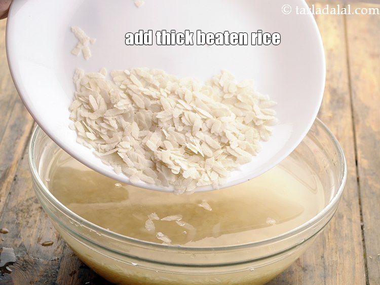 2. Combine the par-boiled rice and thick beaten rice and enough water in a deep bowl and mix well. Cover with a lid and keep aside to soak for 4 hours.