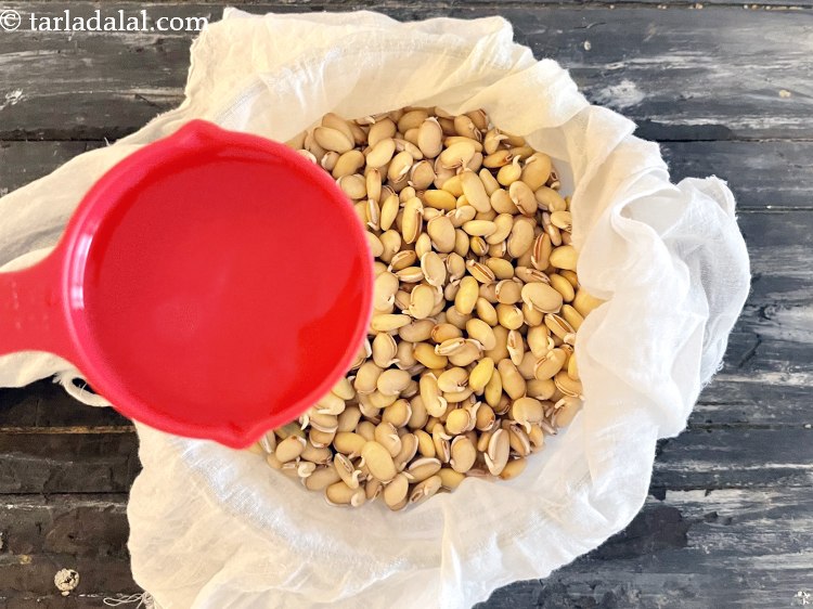 Tips for how to sprout vaal, lima beans. 1. Do remember to soak the beans in warm water and for the said time (15 hours) to get the perfect sprouts after soaking. 2. Patting water on the muslin cloth is a must as air, moisture and warmth are the prerequisites for sprouting. 3. Do not tie the muslin cloth very tight. Leave it slightly loose so there is space for sprouts to grow.