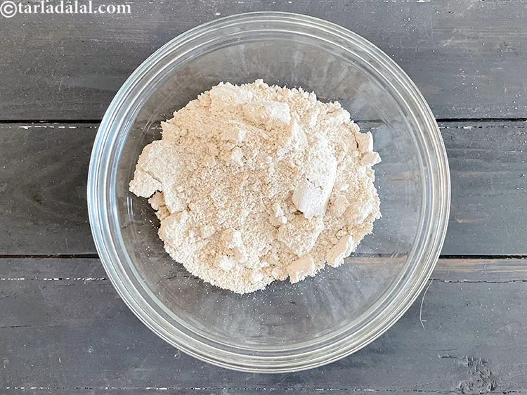 To make Indian style protein brownie bars recipe | chocolate peanut butter protein fudge bars | protein bars with protein powder added | in a glass bowl put 1 cup oats flour. See above on how to make oats flour.