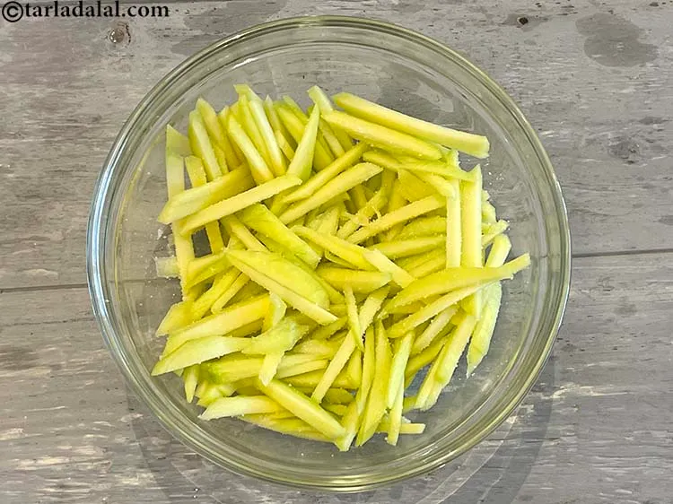 कच्चे आम को पतली स्ट्रिप्स में काट लें।
