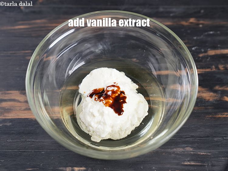 - To make the iyengar bakery style rava cake, in a deep bowl, add oil, curd, vanilla extract, powdered sugar, rava and milk.