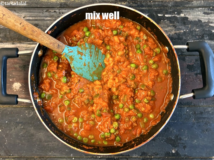 - Add the green peas, raw bananas and 1/2 cup of water, mix well, cook on a medium flame for 5 to 7 minutes, while stirring occasionally.