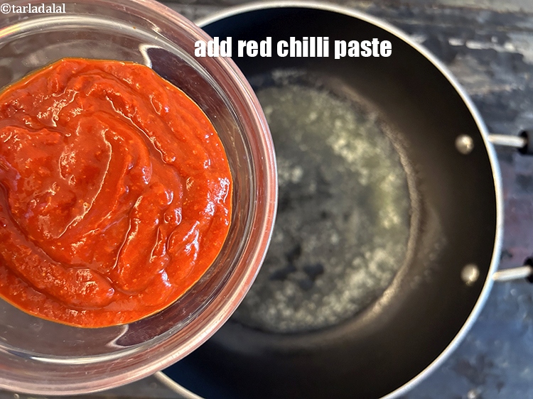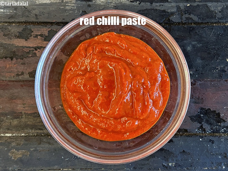 - Combine the soaked kashmiri red chillies with 5 tbsp of water in a mixer and blend to a smooth paste. Keep aside.