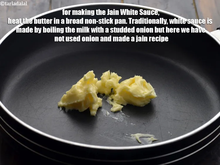 - To make jain white sauce recipe, heat a pan and melt the butter in it.