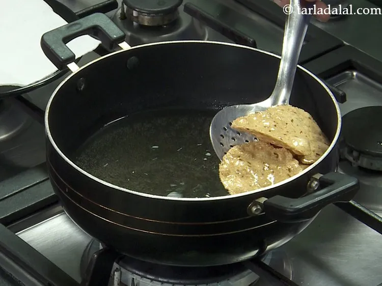 - एक गहरे नॉन-स्टिक पैन में तेल गरम करें और एक समय में कुछ पूरियाँ डालकर, मध्यम आँच पर पूरी कुरकुरी और सुनहरी भूरी होने तक तल लें। एक टिशू पेपर पर निकाल लें।