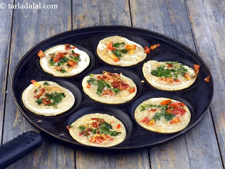 - एक मिनी उत्तपम पैन गरम करें और उस पर 1/2 टी-स्पून तेल लगाकर चिकना कर लें।
