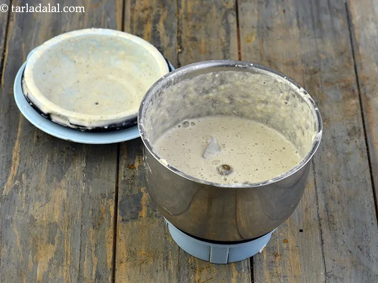 - साबुत ज्वार, उड़द दाल और लगभग १/४ कप पानी को मिक्सर में डालकर मुलायम होने तक पीस लीजिए।