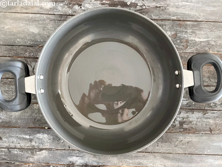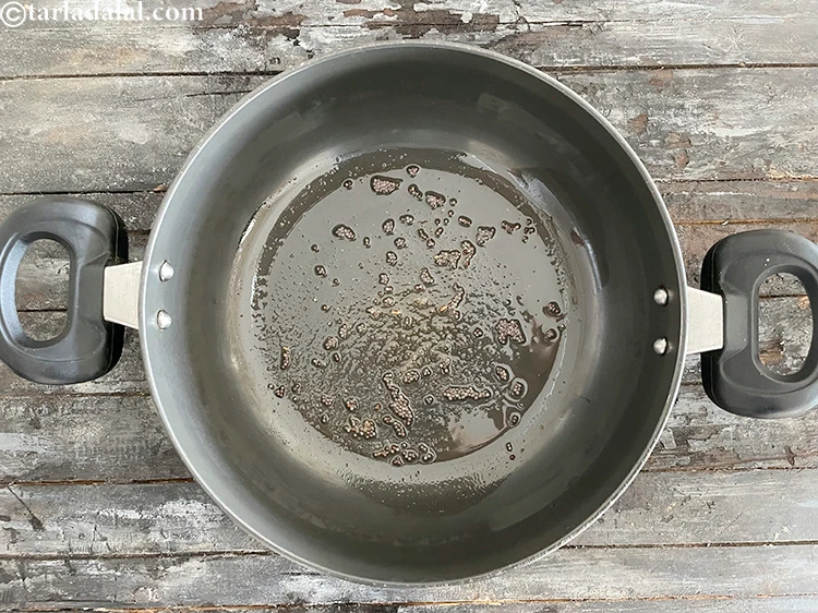3. एक गहरे पैन में तेल गरम करें और उसमें सरसों और हींग डालें।