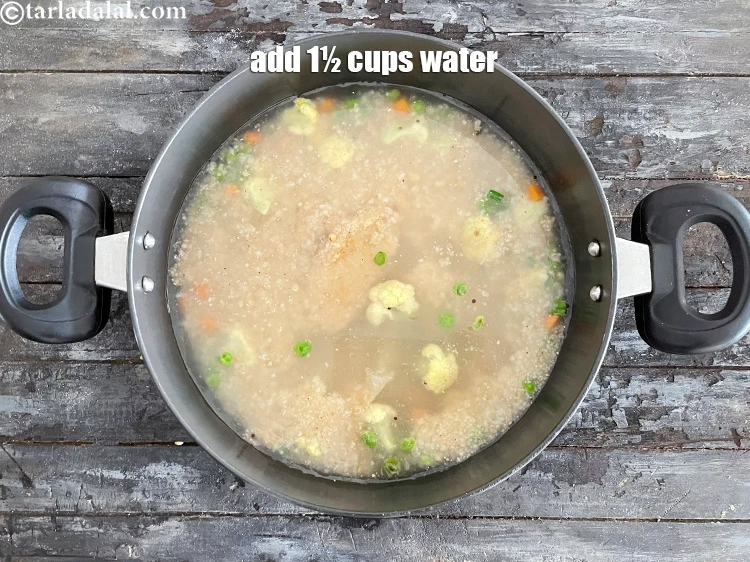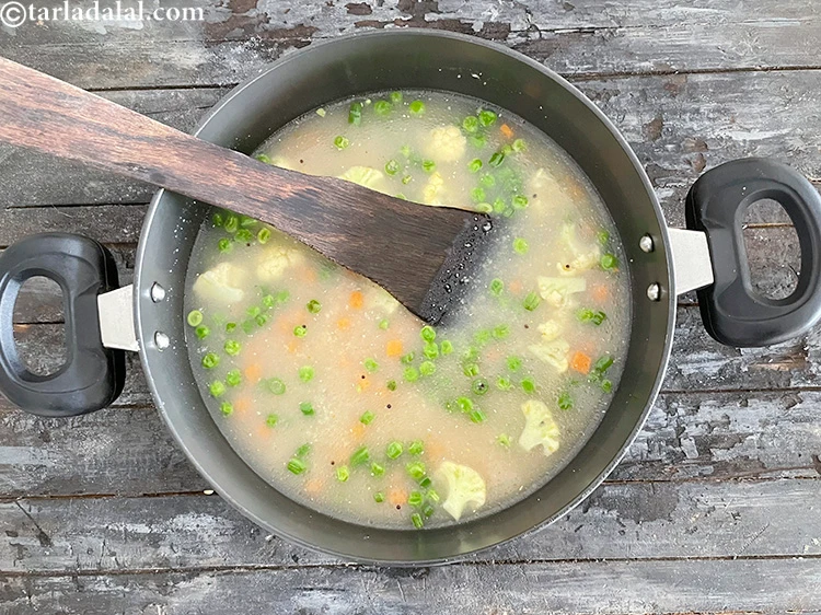 5. 1 कप कटी हुई मिली-जुली सब्जियां (chopped mixed vegetables) (फण्सी , गाजर , हरे मटर और फूलगोभी) डालें। मिक्स सब्ज़ियों में बहुत सारे न्यूट्रिएंट्स होते हैं क्योंकि आप फूलगोभी, गाजर, पत्तागोभी, फ्रेंच बीन्स और हरी मटर का इस्तेमाल कर रहे हैं। फूलगोभी में कार्ब्स बहुत कम होते हैं और इसलिए यह ब्लड ग्लूकोज़ लेवल नहीं बढ़ाती है। एंटीऑक्सीडेंट से भरपूर और फूलगोभी के डिटेल्ड फ़ायदों के लिए यहाँ पढ़ें। पत्तागोभी में कैलोरी कम होती है, कब्ज़ से राहत मिलती है। यह डायबिटीज़ वालों के लिए अच्छा है और यहाँ पत्तागोभी के सभी फ़ायदे देखें। हरी मटर वज़न घटाने के लिए अच्छी होती है, वेजिटेरियन प्रोटीन का अच्छा सोर्स है, इसमें कब्ज़ से राहत देने के लिए इनसॉल्युबल फ़ाइबर होता है। क्या हरी मटर डायबिटीज़ वालों के लिए अच्छी है और हरी मटर के पूरे फ़ायदे देखें।