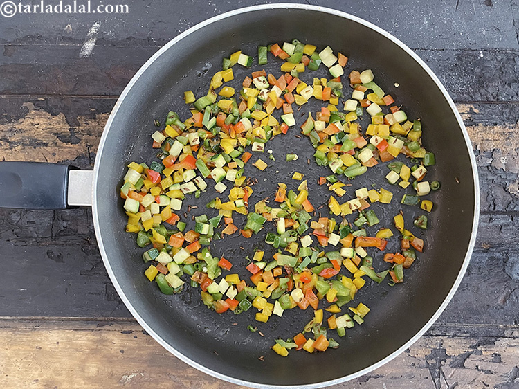 - जब बीज चटकने लगे तो हींग, हरी मिर्च, लाल, हरी, पीली शिमला मिर्च और जुकिनी डालें और मध्यम आंच पर 1 से 2 मिनट तक भून लें।