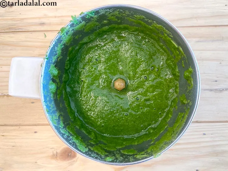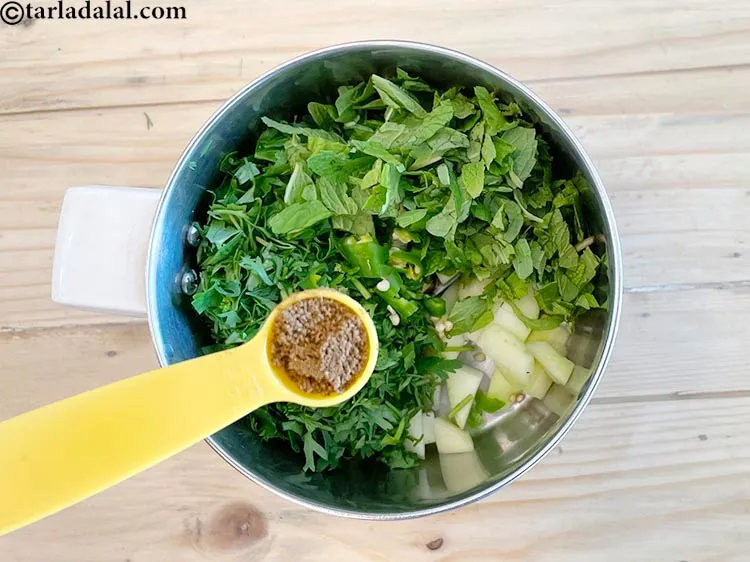 Add 1/2 cup chopped mint leaves (phudina). Mint (pudina) being an anti-inflammatory reduces the inflammation in the stomach and shows a cleansing effect. Sipping on a healthy drink like fresh mint and lemon tea is the best option to overcome nausea for mums-to-be. Moreover it's vitamin A (10% of RDA) and vitamin C (20.25%) serve as an additional boost to bring relief from cough, sore throat and also cold. Mint (pudina) is a leafy vegetable which is sure to create nourishing dishes without piling on calories, carbs or fat for that instance. What is has to offer instead is FIBER. See here for detailed benefits of mint leaves.