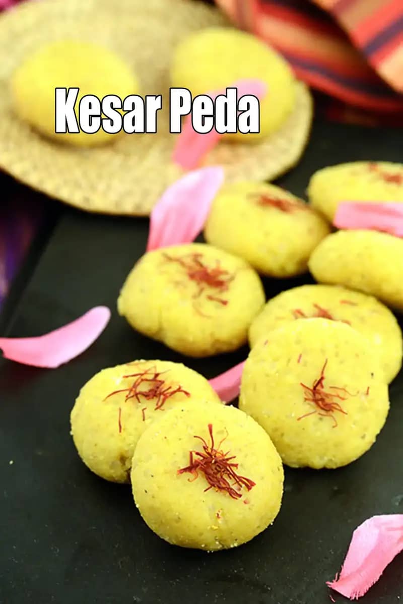 - what is kesar peda made of? instant kesar peda is made from 1/4 tsp saffron (kesar) strands, 2 cups crumbled mawa (khoya), 1 tsp milk, 1/2 cup powdered sugar and 1/4 tsp cardamom (elaichi) powder.