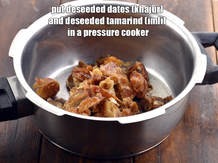 Put the 1 cup deseeded dates (khajur) and 2 tbsp deseeded tamarind (imli) in a pressure cooker. The tamarind provides a little tanginess while the dates make the khajur imli chutney sweet.