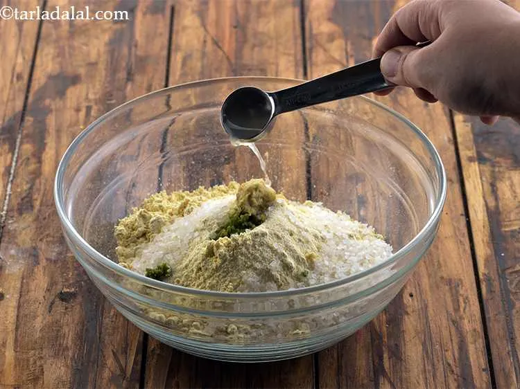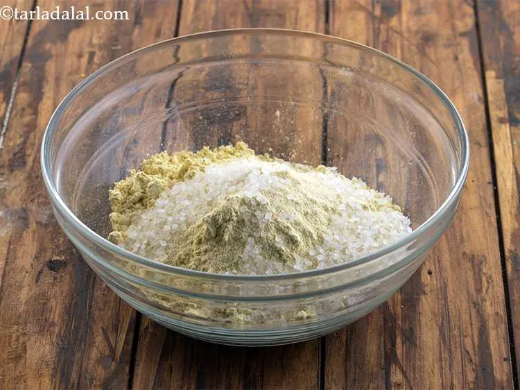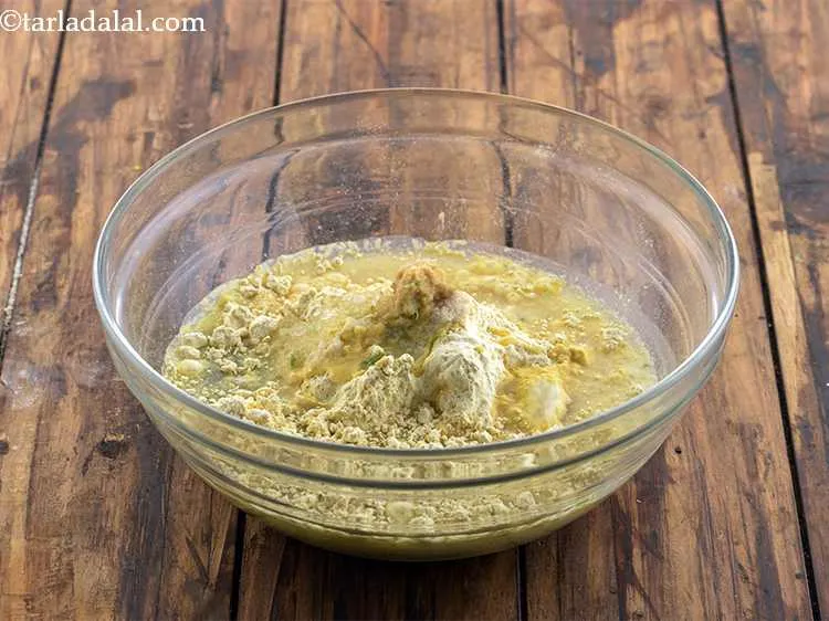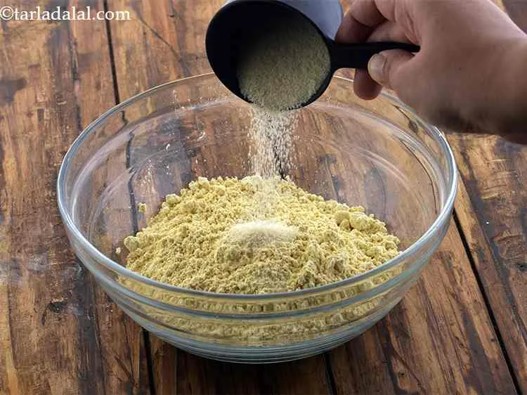 To make khaman dhokla batter, take 1 1/2 cups besan (Bengal gram flour) or gram flour in a large mixing bowl. Besan or chickpea flour gives you a good dose of several nutrients, read 10 Super Health Benefits of Besan to know more.