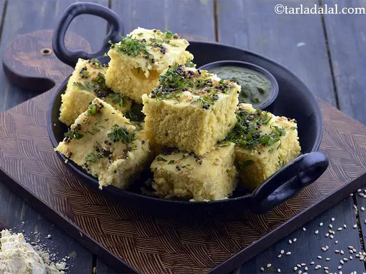 People love these yummy steamed, soft khaman dhoklas as a breakfast, snack or as a farsan (savoury accompaniment.
