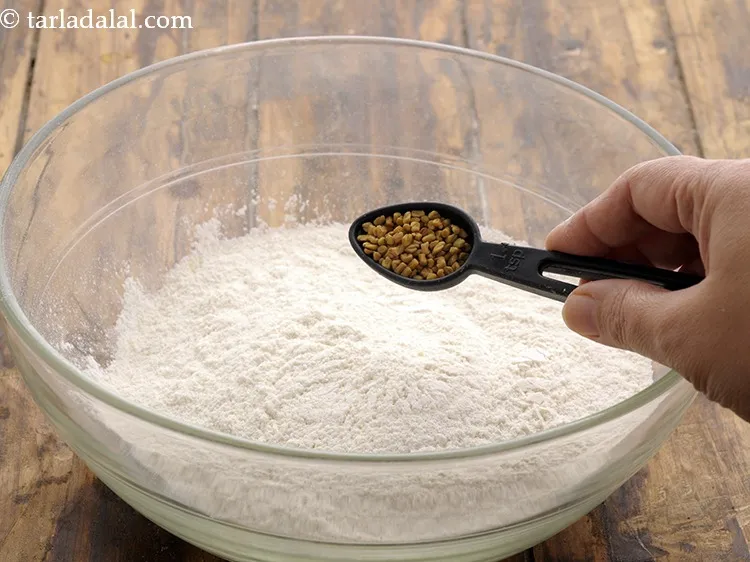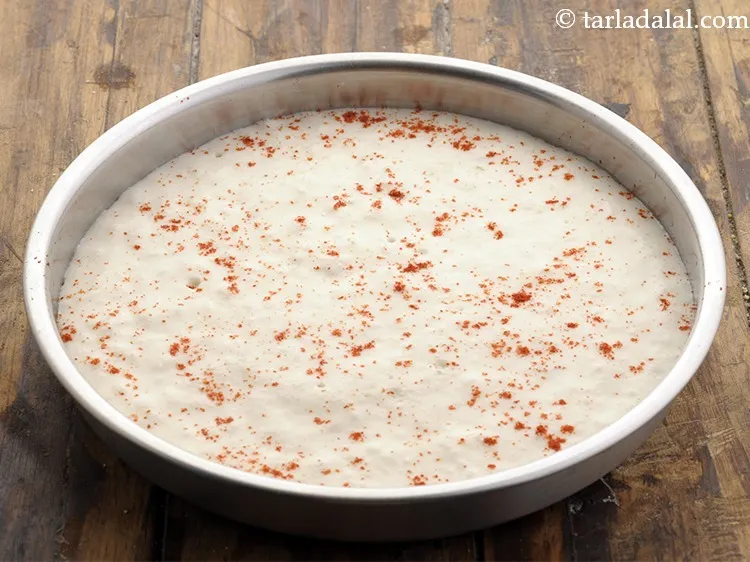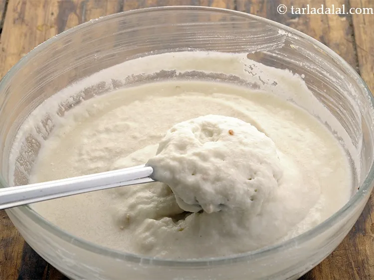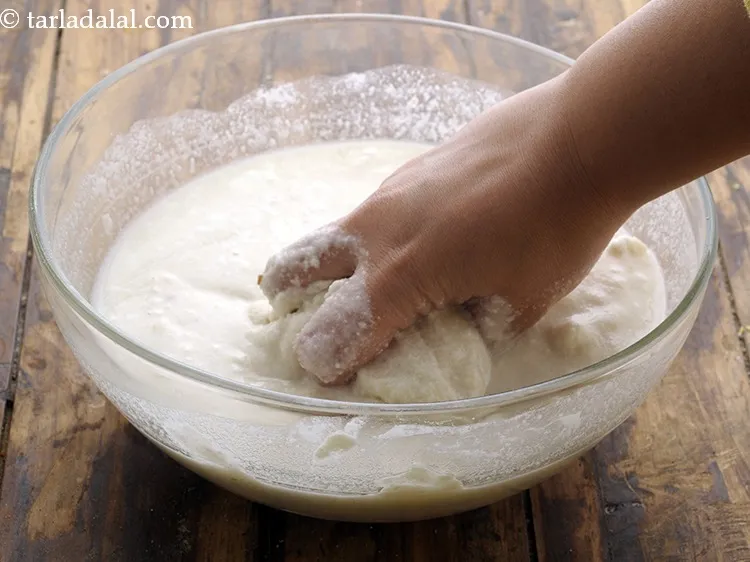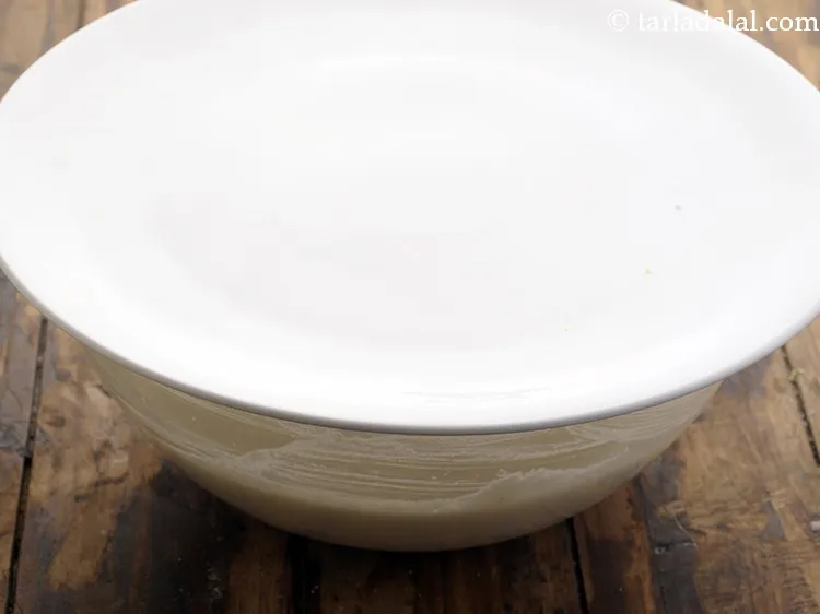 - Combine the khatta dhokla flour, methi seeds, sour curds, white butter and warm water (approx. 2 1/4 cups) in a bowl and mix well using hands. Cover and keep aside to ferment for atleast 8 to 10 hours.