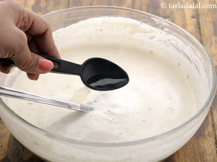 Add baking soda over the oil. Baking soda has to be fresh and it helps in making the dhoklas soft.