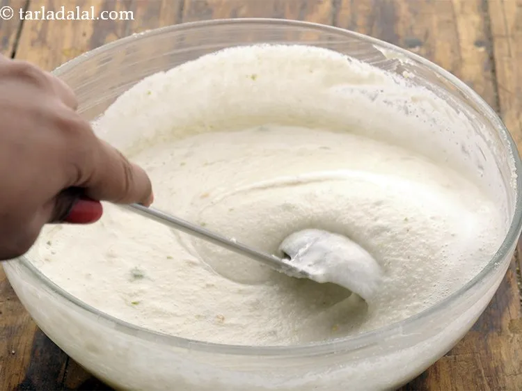 - Mix the fermented batter well, add green chilli, ginger paste and salt. Mix well.