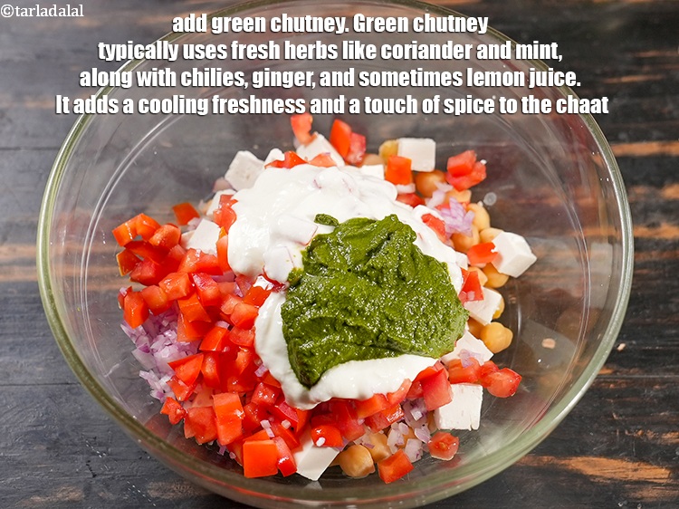 Add 4 tbsp green chutney. Green chutney typically uses fresh herbs like coriander (cilantro) and mint, along with chilies, ginger, and sometimes lemon juice. It adds a cooling freshness and a touch of spice to the chaat.
