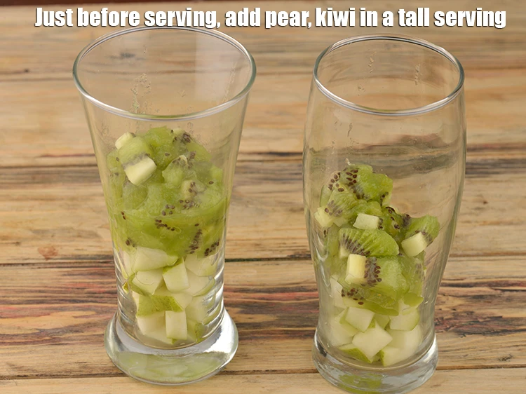 - Just before serving, add ¼ cup of pear, ¼ cup of kiwi in a tall serving and top it with ¼ cup white chocolate sauce evenly over it.