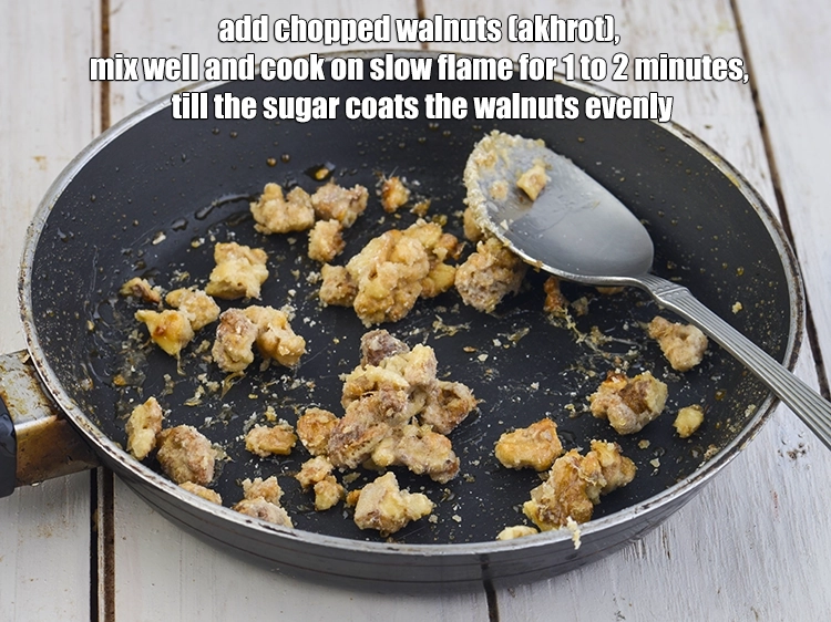 Add the 2 tbsp chopped walnuts (akhrot), mix well and cook on slow flame for 1 to 2 minutes, till the sugar coats the walnuts evenly. Keep aside to cool completely.
