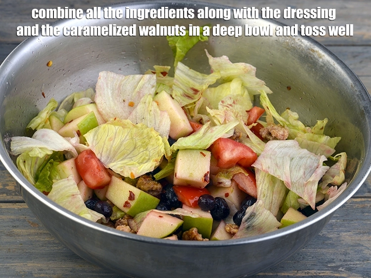 In a deep bowl, add 2 cups lettuce , torn into pieces, 1 cup green apple cubes, 1/4 cup blueberry, and 1/2 cup tomato cubes, all the ingredients along with the dressing and the caramelized walnuts in a deep bowl and toss well.