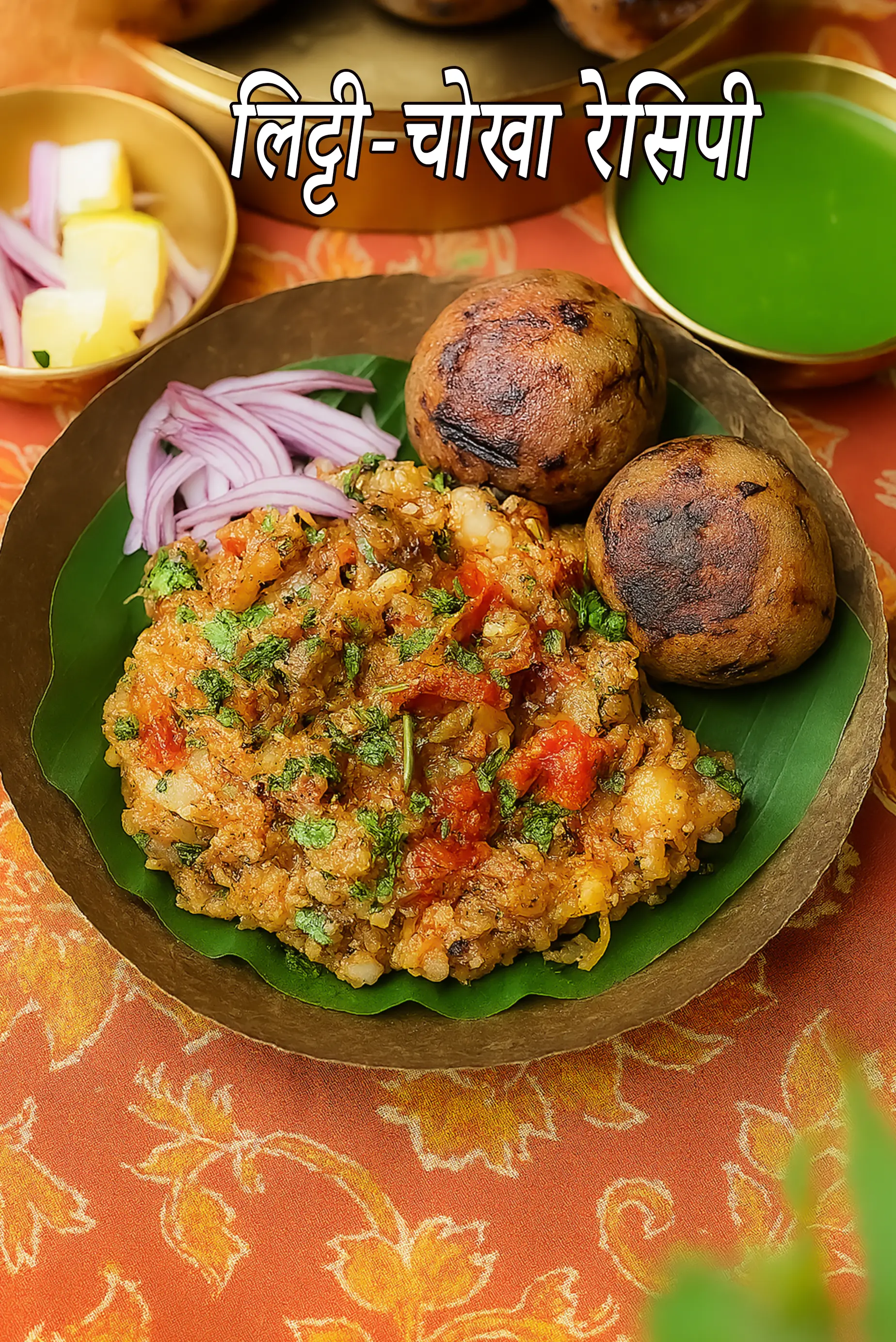 "चोखा," उत्तम संगत, एक ग्रामीण मैश की हुई सब्जी का स्वाद है। यह 2 मध्यम आकार के उबले आलू और 1 मध्यम आकार के बैंगन से शुरू होता है। बैंगन को आधा काटकर सीधे आग पर भुना जाता है जब तक कि वह नरम और काला न हो जाए, जिससे उसे एक धुएँ का स्वाद मिलता है। भुना हुआ बैंगन फिर ठंडा होने के लिए ठंडे पानी में रखने के बाद छील दिया जाता है। 3 मध्यम आकार के टमाटर को उबाला जाता है और मिश्रण में जोड़ा जाता है। इन तीनों सब्जियों को एक साथ मैश किया जाता है, और फिर 2-4 बारीक कटी हरी मिर्च, 1/2 कप बारीक कटा प्याज, 1 बड़ा चम्मच बारीक कटा धनिया (धनिया), 1 छोटा चम्मच सरसों (राई / सरसों) का तेल, और नमक स्वादानुसार के साथ मिलाया जाता है। एक स्वादिष्ट और मोटे चोखा बनाने के लिए सभी सामग्री को अच्छी तरह मिलाया जाता है।