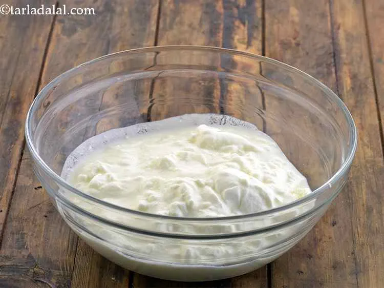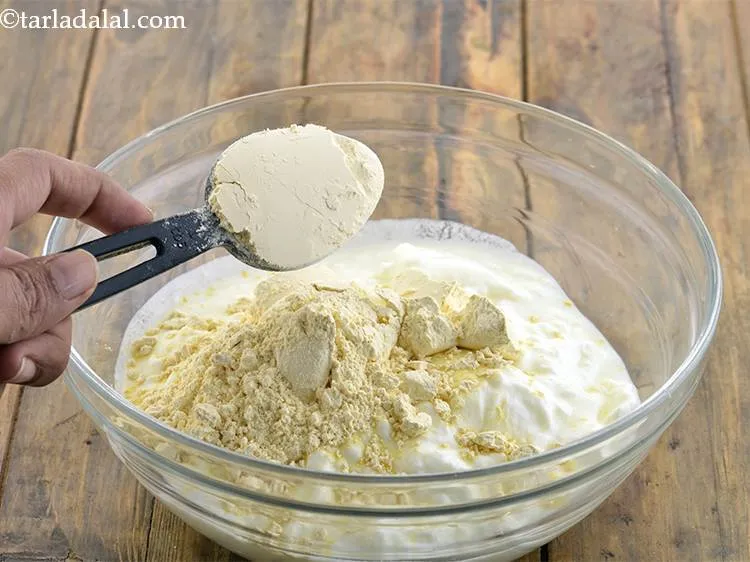 - To make healthy kadhi, combine the curds and besan in a deep bowl and whisk well till no lumps remain.